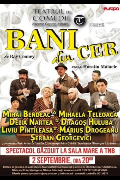 O piesa ce poarta semnatura dramaturgului englez Ray Cooney, Bani din cer este o comedie spumoasa, in care Henry, un modest contabil (interpretat de Mihai Bendeac) isi surprinde sotia atunci cand vine acasa cu o geanta plina de bani, o adevarata comoara ce pare sa ii fi picat pur si simplu din cer. Pare cea mai arzatoare dorinta devenita realitate ca printr-un miracol, dar in ce fel va reusi Henry sa isi schimbe viata si pe cea a intregii familii? Oare acesti bani ii vor face mai fericiti sau dimpotriva? Mai ales ca sotia, Jane Perkins, nu este straina de alcool. Bani din cer este o comedie care va reusi nu doar sa amuze publicul, dar si sa ofere un raspuns la o veche intrebare: oare atunci cand devii pe neasteptate bogate ajungi sa uiti cine esti de fapt si sa te pierzi pe tine?
