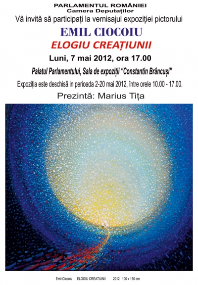Vernisajul expozitiei "Elogiu creatiunii" de Emil Ciocoiu, va avea loc luni, 7 mai 2012, de la ora 17.00, pe simezele prestigioasei sali "Constantin Brancusi" a Palatului Parlamentului din Bucuresti.