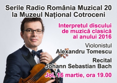 In seara de zilei de 16 martie, Alexandru Tomescu va interpreta in Sala Cerchez a Muzeului National Cotroceni, lucrari pentru vioara solo de Bach, repertoriul inclus si pe “Discul de muzica clasica al anului 2016”. La finalul recitalului, violonistul va oferi autografe.