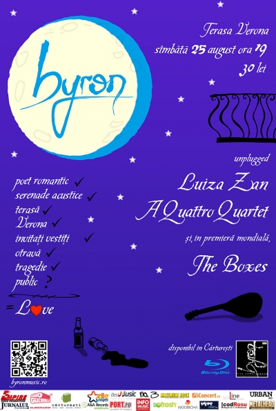 Va asteptam asadar sambata, 25 august, la Terasa Verona alaturi de trupele byron (unplugged), The Boxes si invitatii speciali Luiza Zan si A Quattro Quartet . Muzica va rasuna in gradina celor de la Carturesti incepand cu ora 19:00 iar pretul unui bilet va fi 30 de lei.