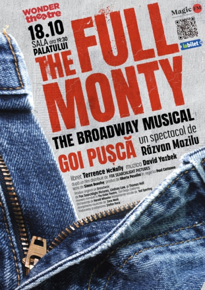 Pe 18 octombrie 2023, de la ora 19.30, Sala Palatului din Bucuresti va prezenta in debutul stagiunii 2023-2024 un nou musical, clasicul The Full Monty (Goi Pusca), o productie a companiei Wonder Theatre. Regia si coregrafia spectacolului sunt realizate de Razvan Mazilu, iar spectacol (nerecomandat copiilor sub 12 ani) este un amestec de umor, muzica, momente de dans, costume, totul intr-o poveste amuzanta si plina de momente memorabile. Un titlu clasic pentru Broadway, The Full Monty este povestea a sase barbati din Buffalo, New York, care incearca sa isi depaseasca temerile si prejudecatile, dar si sa gaseasca o solutie mai putin intalnita de a castiga bani. Si in acelasi timp sa se distreze si sa fie pentru o seara adevarate vedete. Daca ai datorii, ai de platit o pensie alimentara, ti-ai pierdut locul de munca si perspectivele nu sunt tocmai pozitive, iar depresia este deja o realitate, rezolvarea oferita de The Full Monty ar putea fi ceea ce trebuie.