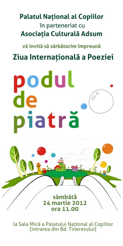 Daca aveti copii sau sunteti copii, daca doriti sa mai fiti pentru cateva ore copii, daca iubiti poezia, muzica, dansul si copiii, Palatul National al Copiilor in parteneriat cu Asociatia Culturala ADSUM va invita sa sarbatoriti impreuna Ziua Internationala a Poeziei, pe PODUL DE PIATRA.