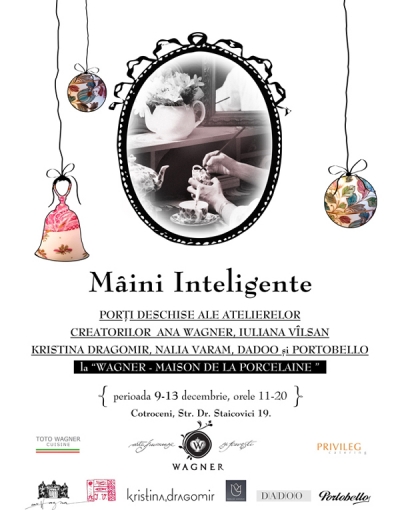 Intre 9 si 13 decembrie 2011, portile atelierului de portelanuri pictate manual Wagner Maison de la Porcelaine din str. Dr. Staicovici 19, se deschid pentru una dintre cele mai frumoase invitatii la deschiderea sezonului de cumparaturi de iarna: "Maini inteligente”, un eveniment-creuzet care gazduieste timp de 5 zile alaturi de brandul Wagner Arte Frumoase si Povesti unele dintre cele mai frumoase cadouri de sezon.