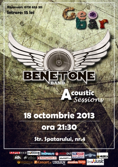 Vineri, 18 octombrie 2013, bucurestenii sunt invitati de la orele 21:30 la un concert acustic Benetone Band in Geobar (Str. Spatarului nr 4 - Zona Armeneasca). Cu acest prilej Alex Porro, Mircea Alex si Edi vor interpreta pentru ascultatori, intaia data in acest an, piese din repertoriul Bon Jovi, Guns, Deep Purple, Eric Clapton, Sting sau Metallica in varianta acustica!