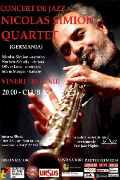 Nicolas Simion, unul dintre cei mai originali saxofonisti din Europa, va sustine vineri, 10 iunie 2011, de la orele 20,00, un concert de jazz in Club RS din Iasi.