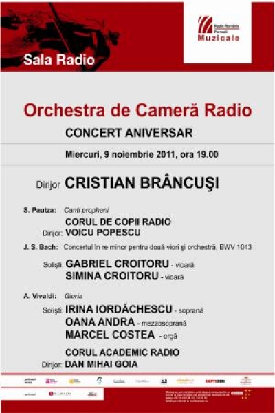 In programul deosebit al acestei seri festive, Orchestra de Camera Radio va propune: Canti prophani de Sabin Pautza cu participarea Corului de Copii Radio condus de Voicu Popescu, Concertul in re minor pentru doua viori si orchestra de Johan Sebastian Bach la care isi vor da concursul si violonistii Gabriel si Simina Croitoru.