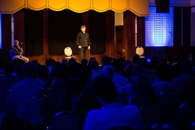 Ion Caramitru şi Aurelian-Octav Popa răspund întrebărilor publicului din Chicago. Credit foto: ProArtPhotoVideo