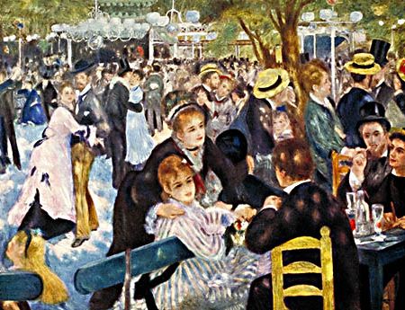 In aceasta perioada Renoir a realizat si cateva dintre cele mai apreciate scene impresioniste, inclusiv "The Swing" si "The Ball at the Moulin de la Galett" (ambele in 1876). Aceste lucrari scot in evidenta cele mai simple atitudini si interpretari ale artei si vietii. Compozitiile infatiseaza barbati si femei, petrecandu-si timpul impreuna, deschisi si joviali, alcatuind o societate placuta scaldata intr-o lumina calda si blanda. Figurile par sa se amestece una cu alta si cu spatiul inconjurator. O lume placuta, senzuala, plina de energie si caldura umana.