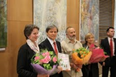 Foto de la expozitia la Comisia Europeana, sala Berlaymont, mai 2011, Cezara Kolesnik impreuna cu: comisarul european Dacian Ciolos, sculptorul Dumitru Verdianu, pictorita Natalia Plamadeala si ambasadorul Republicii Moldova in Belgia, Mihai Gribincea, expozitia" Podul de flori", organizata de Ludmila Bulgar Institut Européen pour la Moldavie.