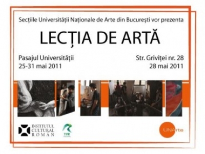 “Lectia de Arta” va fi sustinuta miercuri 25 Mai la ora 17.00 de catre studentii sectiei de Scenografie, iar vineri - 27 Mai, ora 17.00 - cei prezenti vor avea parte de o prezentare realizata de sectia de Moda.