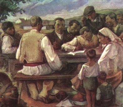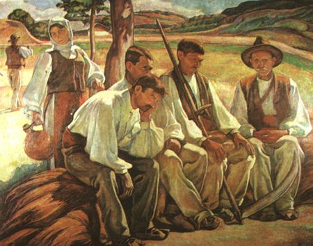 Camil Ressu (1880,Galati-Romania-1962, Bucharest- Romania) From 1897 to 1899 he studied at the Fine Arts School in Bucharest with Professor G.D. Mirea. He continued his studies at the Fine Arts School in Jassy with Professor Gheorghe Popovici. In 1902 after a visiting tour of the Munich museums, he would go to Paris for studying at the Julian Academy as an apprentice to Jean Paul Laurens. After coming back to Romania in 1908 he would try his hand at making caricatures for such publications as "Adevarul", "Furnica", "Facla" and "Cronica". Soon he would join the "Artistic Youth" events, participate in official salons and other group exhibitions in the country or abroad. During his life he had two personal exhibitions in Bucharest (in 1914 and 1955 respectively). In 1917 he was one of the founding members of the "Romanian Art" Society, to include painters Nicolae Darascu, Stefan Dimitrescu, Iosif Iser and others. Also he was on the initiative taken in 1921 for setting up the Romanian Plastic Artists' Trade Union he was to preside over for two years. Professor and Rector of the Academy of Fine Arts in Bucharest so far as 1941. Starting with 1950, he was honorary president of the Plastic Artists' Union, to resume at the same time his academic position as professor at the "N.Grigorescu" Arts Institute. He was awarded in 1955 the People's Artist title, to become one year later a member of the Romanian Academy. Being largely exercised in studies of human body, of landscapes and objects under his eyes, he would, conscious of the drawing and colours performance, dare to innovate the art language while keeping the traditional values intact. His attachment to traditional values was mainly proved by his pictures of the village world seen as an immemorial preserver of those traditions. Between 1918 and 1939 he painted Semanatorii/The Sowers, Mocani din Vlaici/Shepherds from Vlaici, Tarani la pranz/Peasants Taking Their Lunch, Cosasi odihnindu-se/Harvesters At Rest, Odihna la camp/Taking A Rest in the Field. He realised portraits of personalities, seen as individuals (Stefan Luchian, Tudor Arghezi, Iancu Brezianu) or as protagonists of a scene with highly emotional connotation (Cafeneaua "Otetelesanu"/The Otetelesanu Cafe, a painting shown in 1913). Image: "Mower Resting" ; "Signing the Peace Appeal" ; "Peasant with Scythe" |