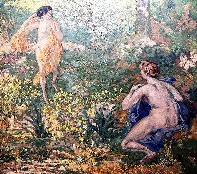 During his highschool years he met Edouard Vuillard, whose sister Marie he would marry in 1893. The two, together with Maurice Denis and Paul Serusier enrolled at the Academie Julian, but left the institution in 1890, dissapointed by the conservatorism of the school. Roussel will be a member of the Nabis and participated at several of the group’s exhibition, such as those at the Cafe Volpini in Paris. He used a style strongly influenced by the sinthetism of Serusier, with wide, flat surfaces, repeated colors and dark lines, trying to create a rhytm. Like the other Nabis artists he did more than just easel painting, producing several murals, stained glass and especially litographies. He also colaborated with Ambroise Vollard, who included some of Roussel’s litographies in his albums, published in Paris.