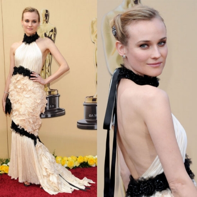 Diane Kruger looked astonishing in the cream and black colored Chanel Haute Couture dress. She also wore Chanel Fine Jewelry black and white diamond Camelia Nature hair brooch, white gold and diamond Camelia earrings and Jaeger-LeCoultre and Swiss Watch diamond art deco watch bracelet and a black satin Chanel clutch.